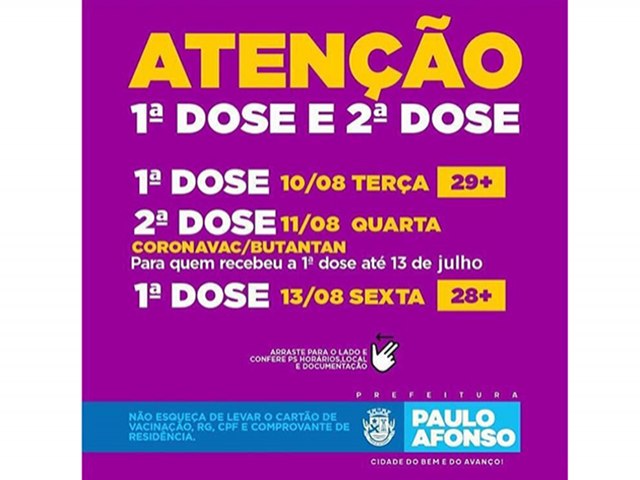 Com o recebimento de novas doses, Paulo Afonso amplia a imunização de primeira dose e segunda dose, nesta semana. A programação vacinal tem início nesta terça-feira (10), para a faixa etária a partir dos 29 anos, na quarta-feira (11) com segunda dose da Coronavac/Butantan e na sexta (13), com primeira dose para pessoas com 28 anos acima.