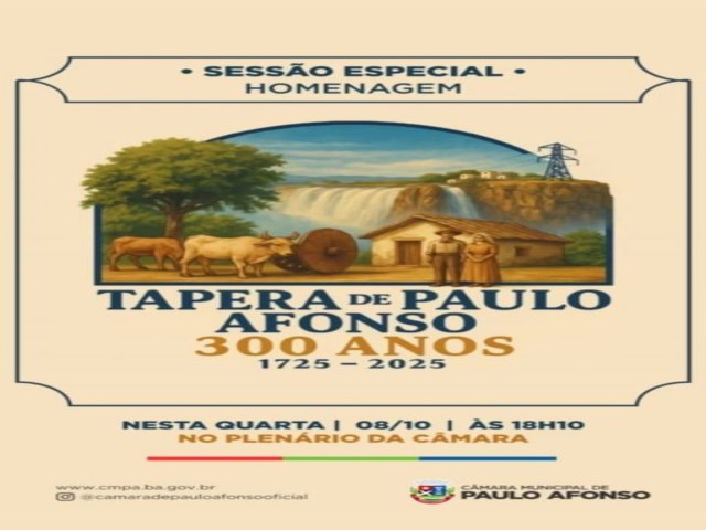 A Câmara Municipal de Paulo Afonso convida toda a população para participar da Sessão Especial em homenagem aos 300 anos da Tapera de Paulo Afonso, de autoria da vereadora Sheila Belo Lima, aprovada por unanimidade na Sessão Ordinária n° 2197, realizada em 29 de setembro de 2025.